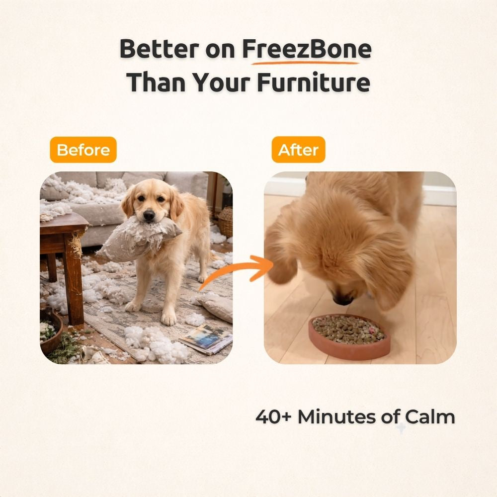 Creating the ultimate frozen treat is all about creativity. Start with your Freezbone and fill it with whatever suits your pup’s taste and diet, from their regular kibble to liquid fillers, tasty spreads, or Freezbone filler pouches. Mix and match, layer textures, or keep it simple, there’s no wrong way to do it. The goal is to turn treat time into a fun challenge that keeps your dog engaged and rewarded.